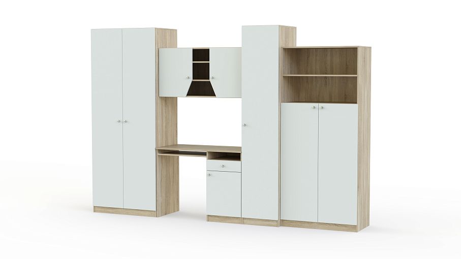 Нейтральная расцветка под массив светлого дуба, современный дизайн, оригинальная фурнитура – детская стенка Белла Р BMS непременно понравится подросткам. В комплекте письменный стол с тумбой и полкой для клавиатуры, навесной шкафчик, двухдверный одежный шкаф, пенал и комбинированный шкаф с открытыми полками и распашным отделением. Продуманная система обеспечит необходимым для учебы и досуга вещам удобное хранение. Благодаря лаконичной форме стенка легко впишется в интерьер.