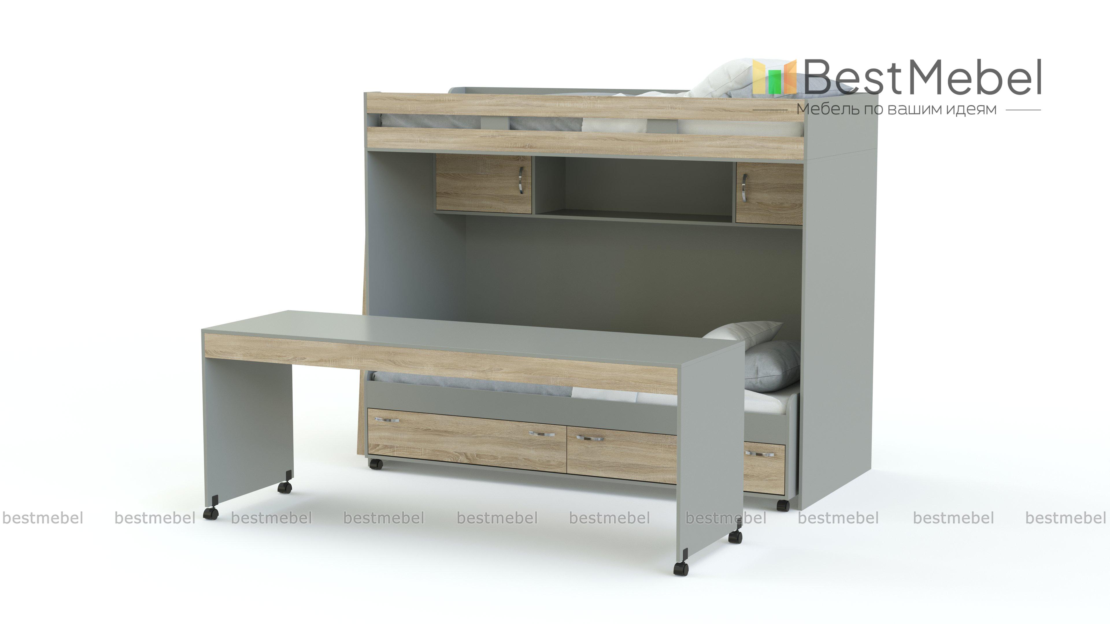 Двухъярусная кровать со столом Фанни 9 BMS гармонично впишется в интерьер современной детской и обеспечит значительную экономию пространства. На втором ярусе располагается спальное место с бортиком, добраться до которого поможет лестница с металлическими перекладинами, а в нише на первом – книжная полка и выкатная кровать с бельевыми ящиками в основании. Дополняет практичную композицию письменный стол с колесными опорами. Купить двухъярусную кровать со столом Фанни 9 BMS для комфортного сна и учебы детей приглашаем в наш интернет-магазин.