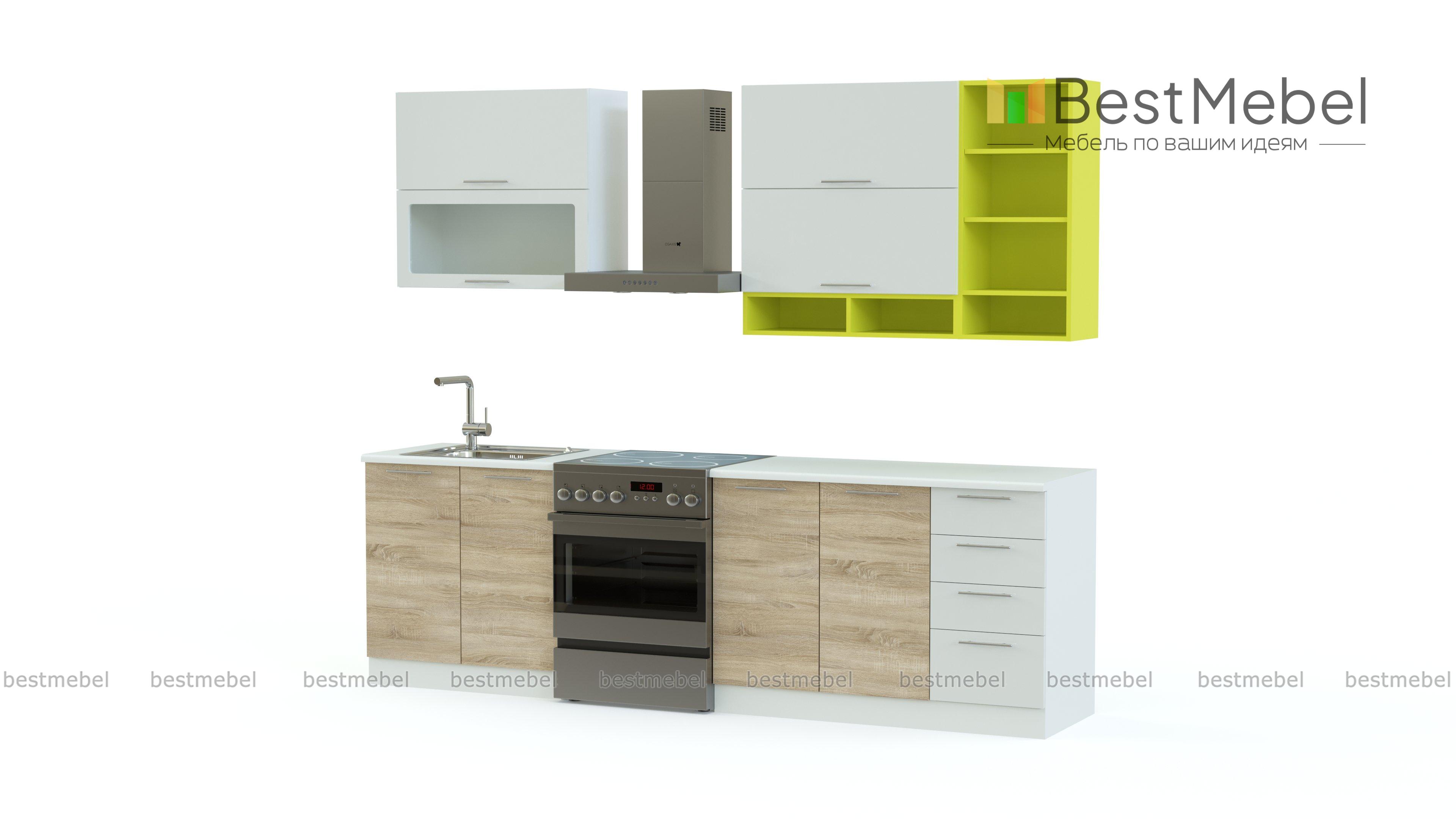 Кухня София микс BMS – компактная кухня современного дизайна, которая сразу привлекает внимание гармоничным сочетанием классических оттенков под массив дерева и контрастных тонов. Для максимального удобства размещения бытовой техники, посуды и столовых приборов модель оборудована в нижней части тремя тумбами – под мойку, с распашными отделениями и выдвижными ящиками. Навесные элементы – открывающиеся вверх ящики и открытые полки. Купить кухню София микс BMS по лучшей цене приглашаем в наш интернет-магазин.