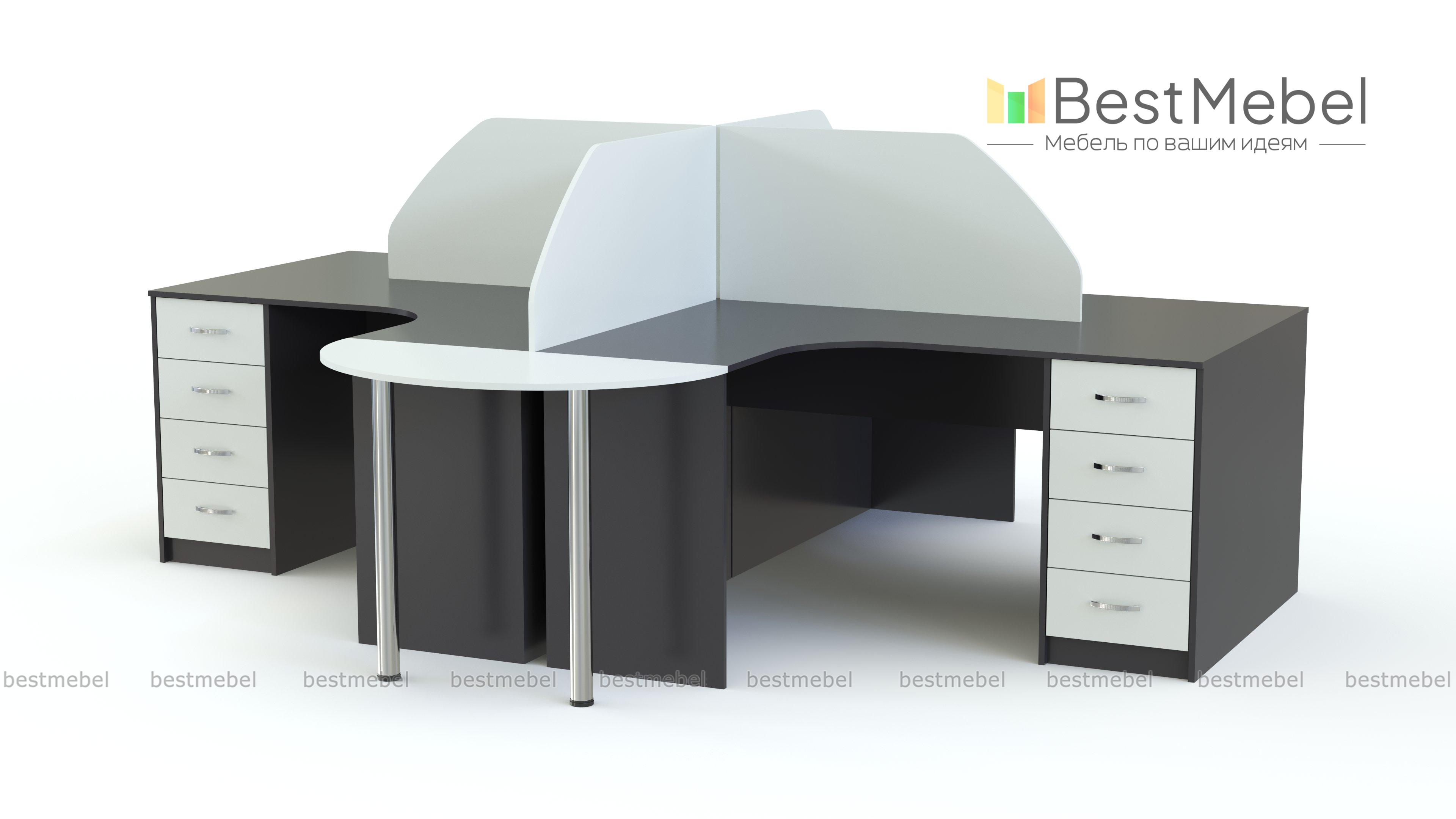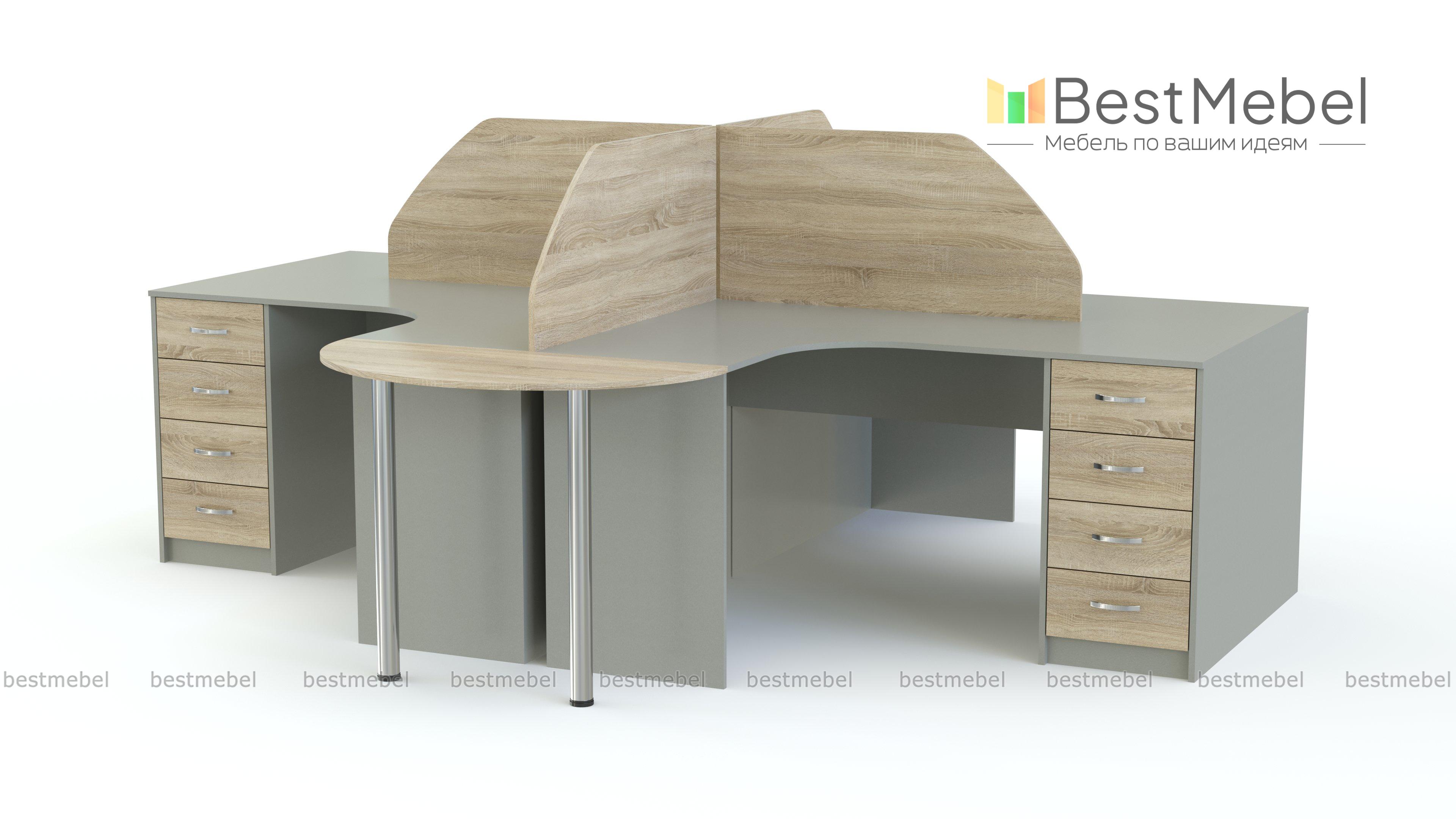 Бенч-система Арагорн 7 BMS поможет рационально организовать пространство современного опен спейса. Четыре угловых стола с эргономичным вырезом переднего края дополнены тумбами для хранения документов и скругленными приставными модулями на металлических опорах. Фигурно вырезанные перегородки, расходящиеся из центра, придают индивидуальность нейтральному офисному дизайну. Купить бенч-систему Арагорн 7 BMS вы сможете в нашем интернет-магазине с выбором размеров и цветовой гаммы.