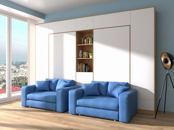 Шкаф-кровать Рубин Дуо BMS воплощает современный подход к организации пространства. Многофункциональная композиция, объединившая удобную систему хранения, зону отдыха и два полноценных спальных места, станет отличным решением для комнаты двоих детей. Стенка с антресолью, отделениями для одежды и открытыми книжными полками дополнена откидными встроенными кроватями и парой кресел. Выполненный в стиле минимализм, комплект характеризуется визуальной легкостью и не перегружает комнату деталями. Купить шкаф-кровать Рубин Дуо BMS вы сможете в нашем интернет-магазине.