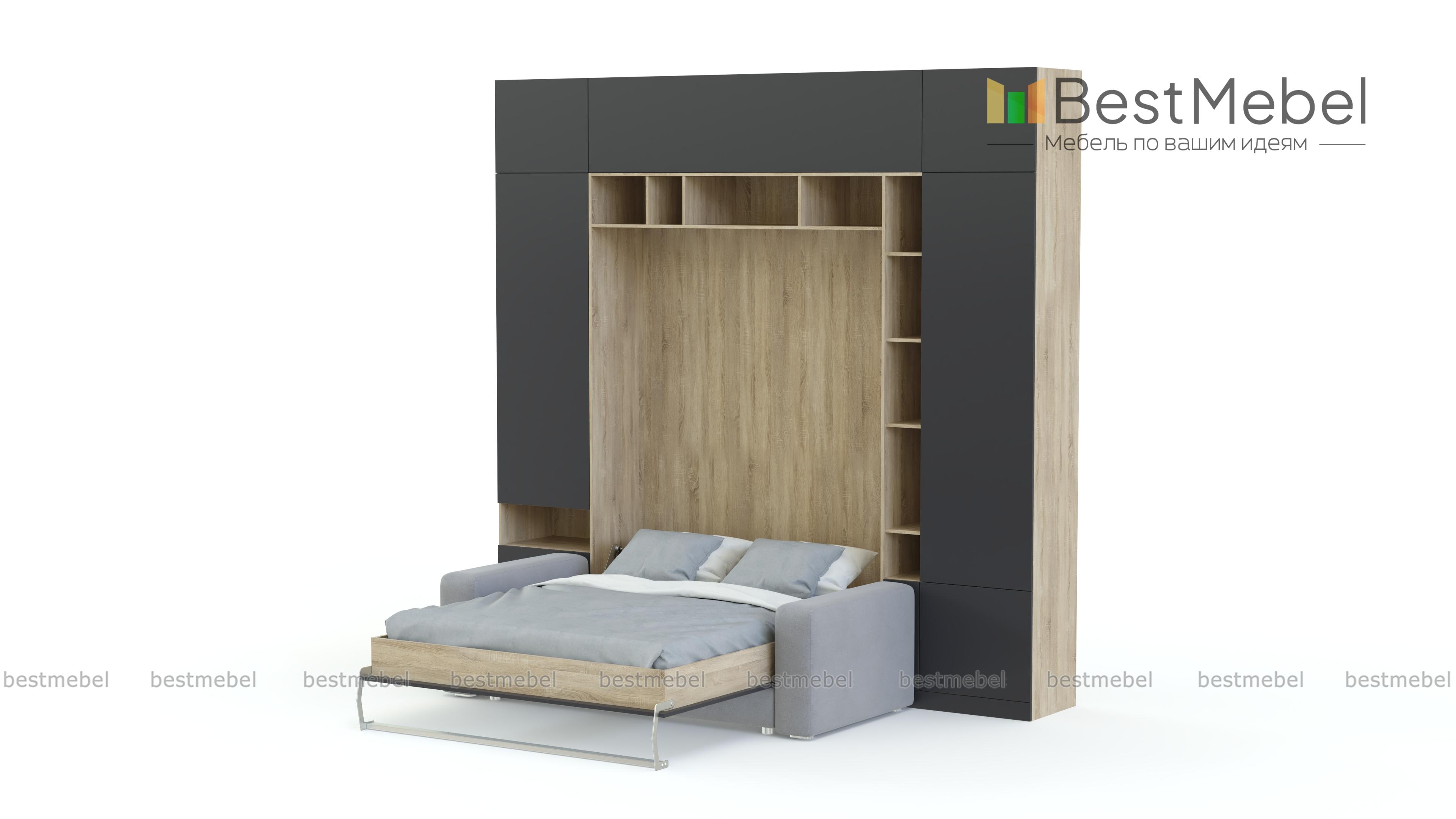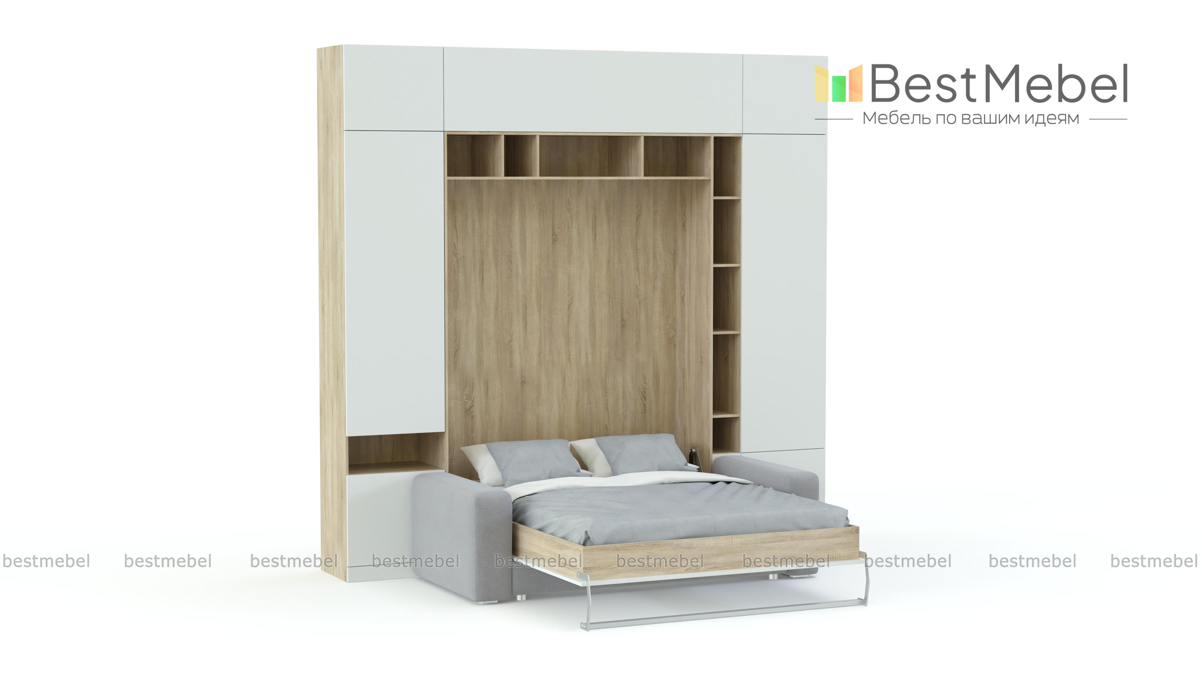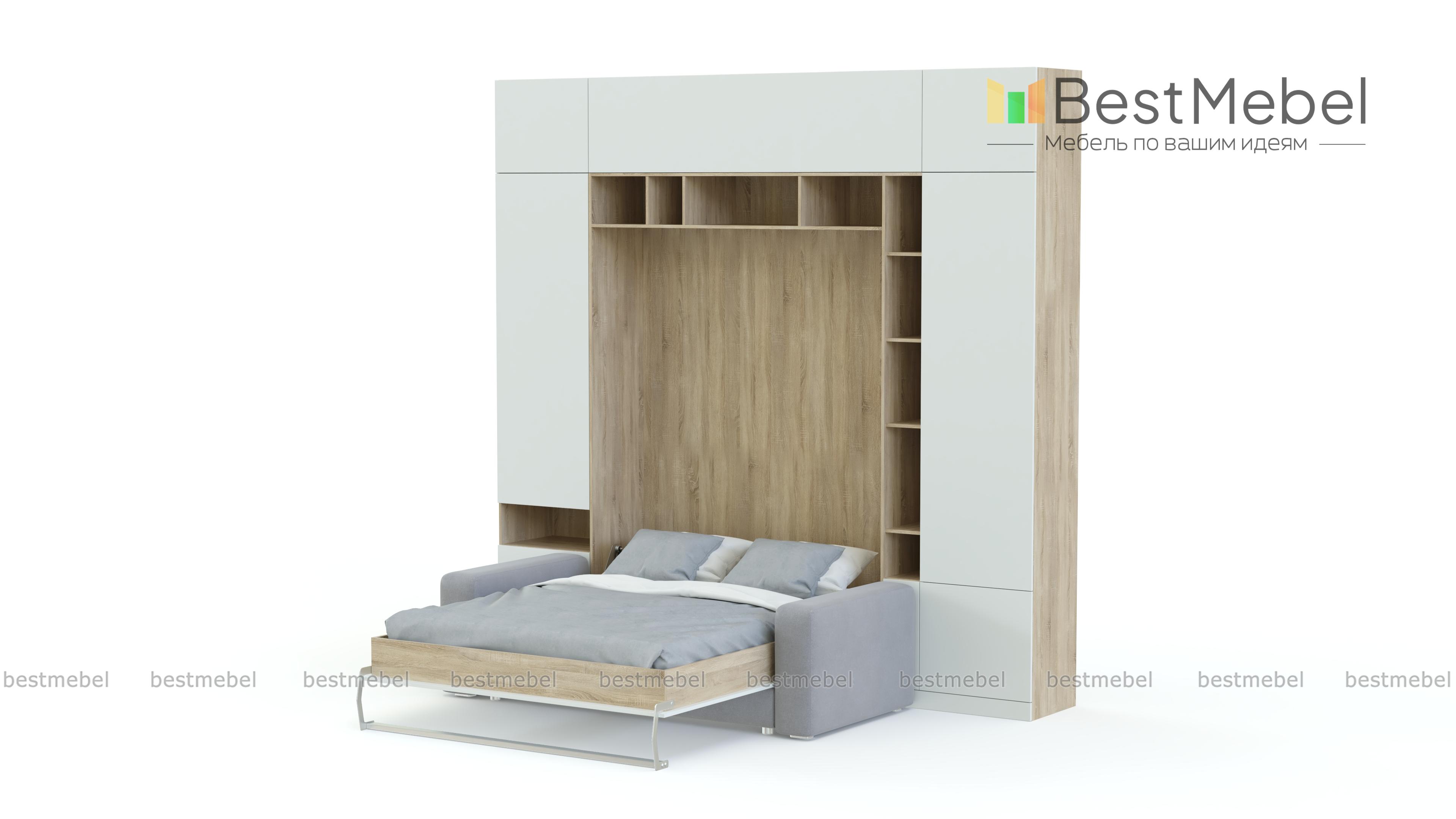 Шкаф-кровать Тида 06 BMS по достоинству оценят владельцы малогабаритных квартир и студий. Создать функциональный, визуально легкий и светлый интерьер в стиле минимализм поможет вам композиция 3 в 1. Стенка с белоснежным глухим фасадом, дополненным цветными вставками открытых полок, оборудована удобной системой хранения и модулем с откидной кроватью, а комфортный отдых подарит уютный мини-диван. Полноценное спальное место вы получаете при помощи надежного вертикального механизма. Купить шкаф-кровать Тида 06 BMS приглашаем в наш интернет-магазин.