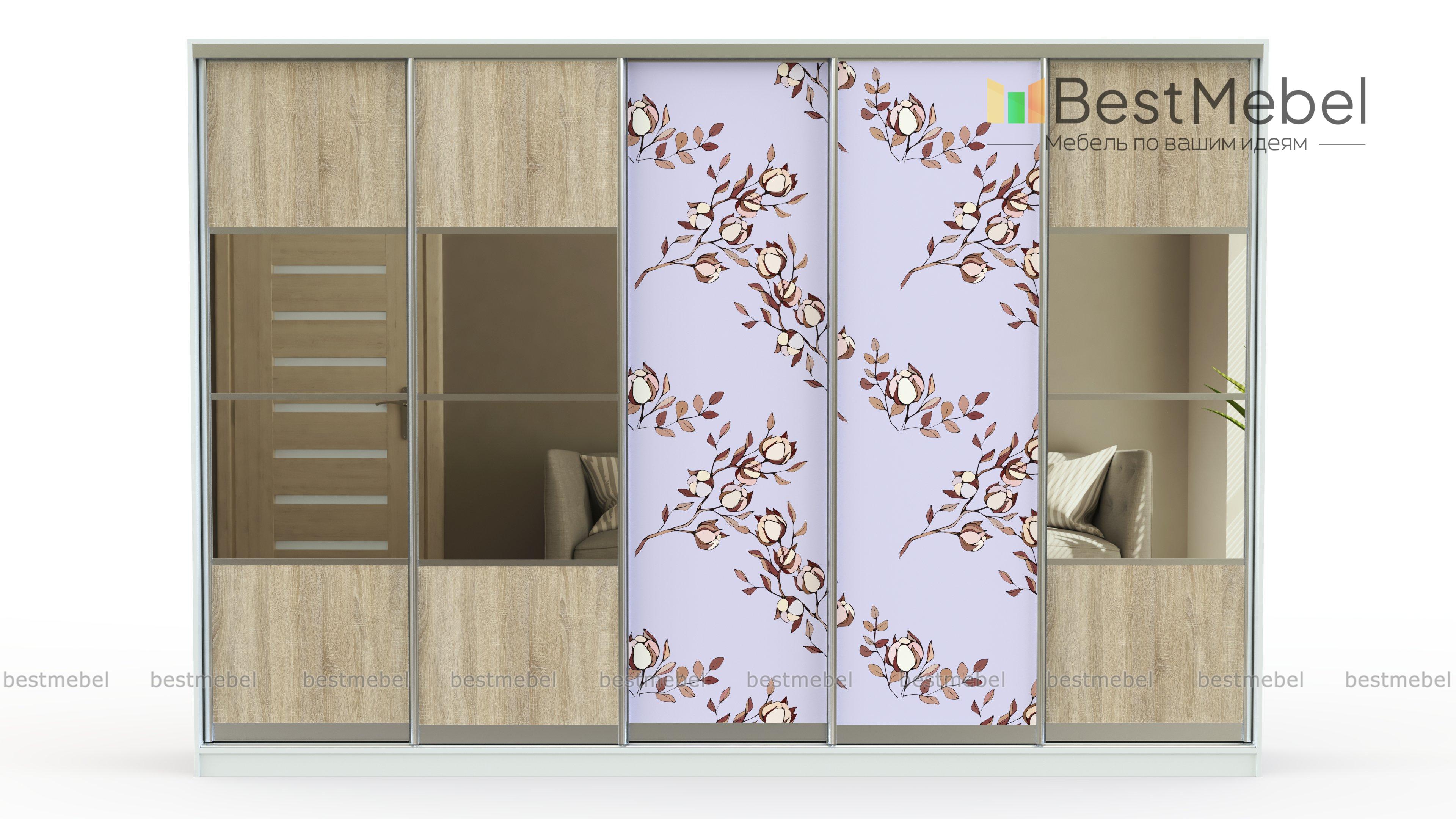 Шкаф-купе Аура 8 BMS сочетает в оформлении фасада износостойкую ламинированную плиту, фотопечать и зеркала. Нежный цветочный принт создает атмосферу весеннего дня, а древесные оттенки добавляют интерьеру уюта. Вместительная пятидверная конструкция совсем не смотрится громоздко и обеспечивает компактное хранение большому количеству вещей. Купить шкаф-купе Аура 8 BMS вы сможете в нашем интернет-магазине, подобрав необходимые цвета, размеры и компоновку.