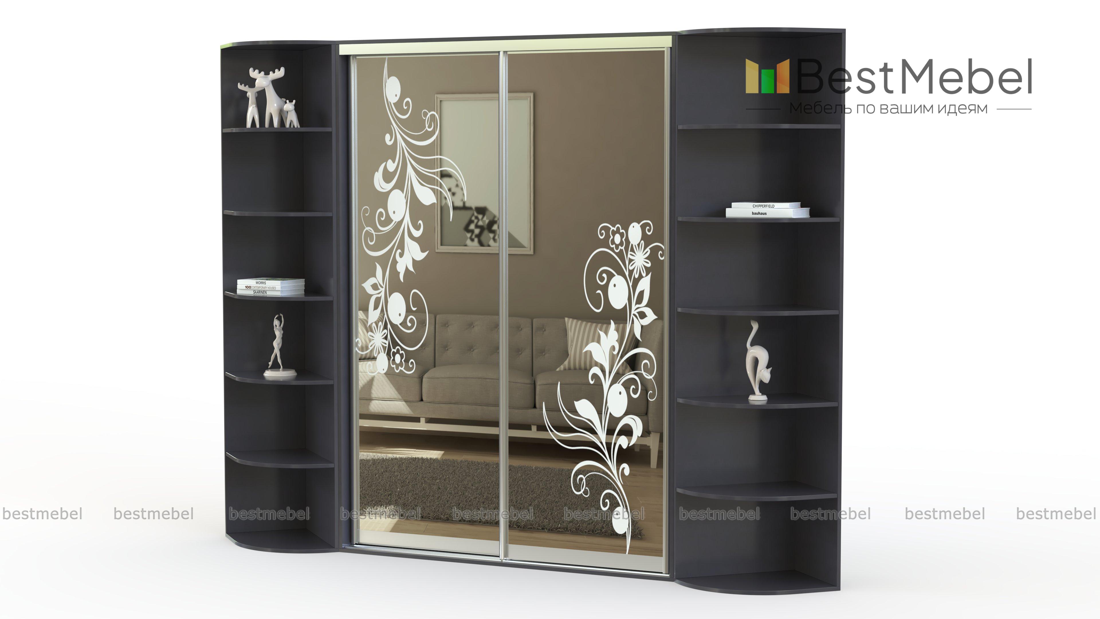Угловой шкаф-купе Оскар-О BMS подойдет для помещения в стиле современной классики. Невесомый зеркальный фасад украшен фантазийным рисунком, а по бокам расположены объемные симметричные стеллажи под массив дерева. Конструкция шкафа позволяет задействовать угловое пространство комнаты и разместить как предметы гардероба, так и книги, аксессуары, важные мелочи и любимый декор. Купить угловой шкаф-купе Оскар-О BMS, изготовленный по вашим размерам, можно на сайте нашего интернет-магазина.