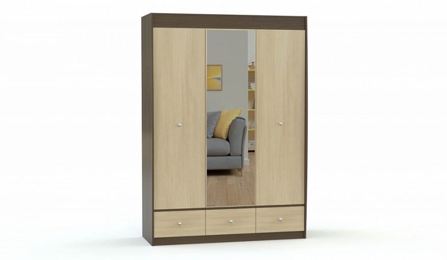 Распашной шкаф Африна BMS подойдет любителям простых и функциональных дизайнов. Недорогая и стильная модель выполнена из ЛДСП в контрастных древесных тонах и оснащена ручками-кнопками. Трехдверное распашное отделение с зеркальной центральной створкой дополнено расположенными в основании тремя выдвижными ящиками для удобного хранения мелочей. Купить распашной шкаф Африна BMS с возможностью выбора цвета приглашаем на сайт нашего интернет-магазина.