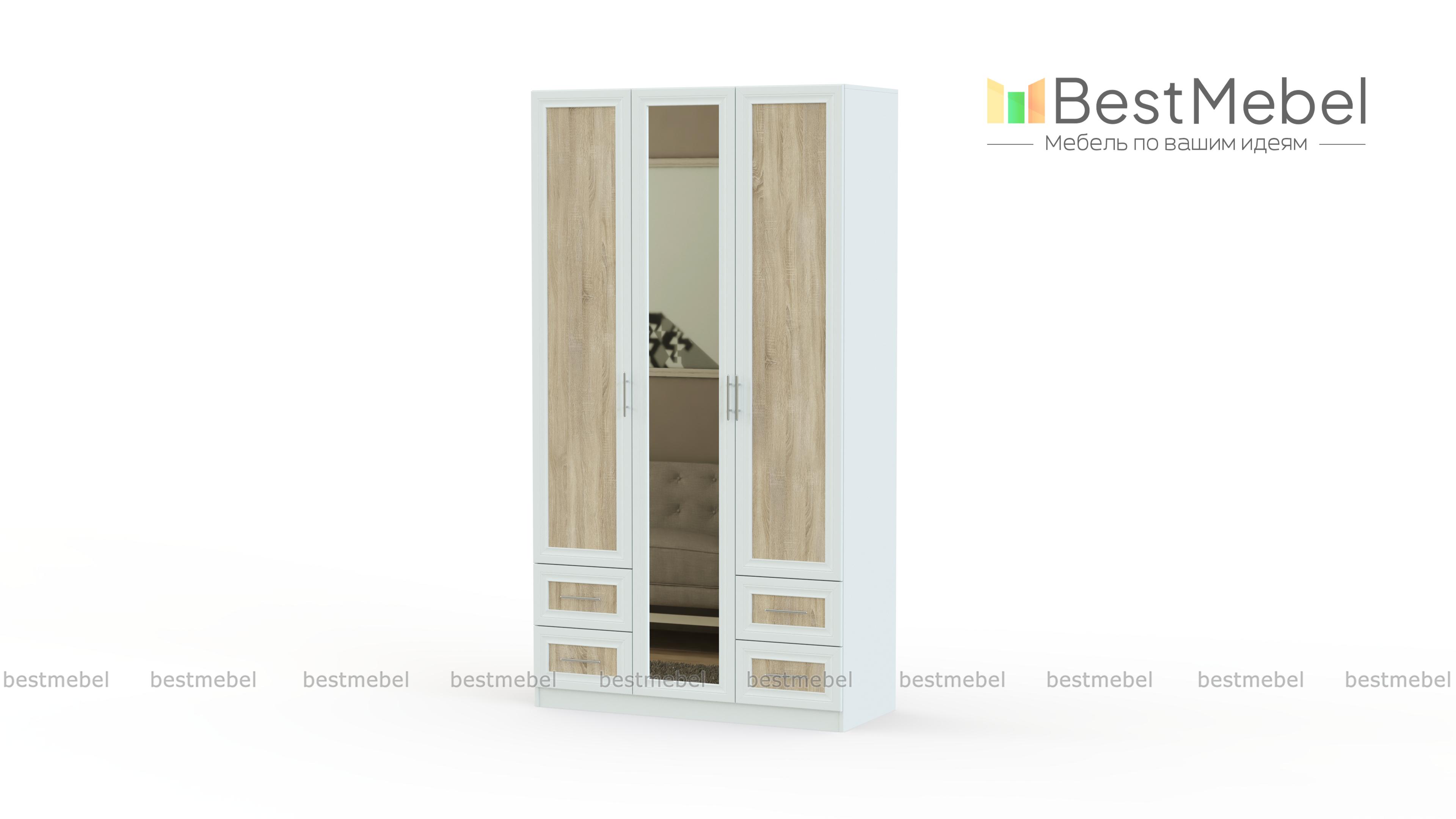 Распашной шкаф Крона 18 BMS станет прекрасным решением как для просторных, так и для небольших помещений благодаря удобным средним габаритам. Выполненный в контрастном сочетании древесных тонов и декорированный зеркалом в полный рост и рамочными фасадами, шкаф отличается не только долговечностью, но и станет настоящим украшением комнаты. За распашными дверцами располагаются платяное отделение и бельевые полки, в нижней части – выдвижные ящики для мелочей. Купить распашной шкаф Крона 18 BMS вы сможете в нашем интернет-магазине.