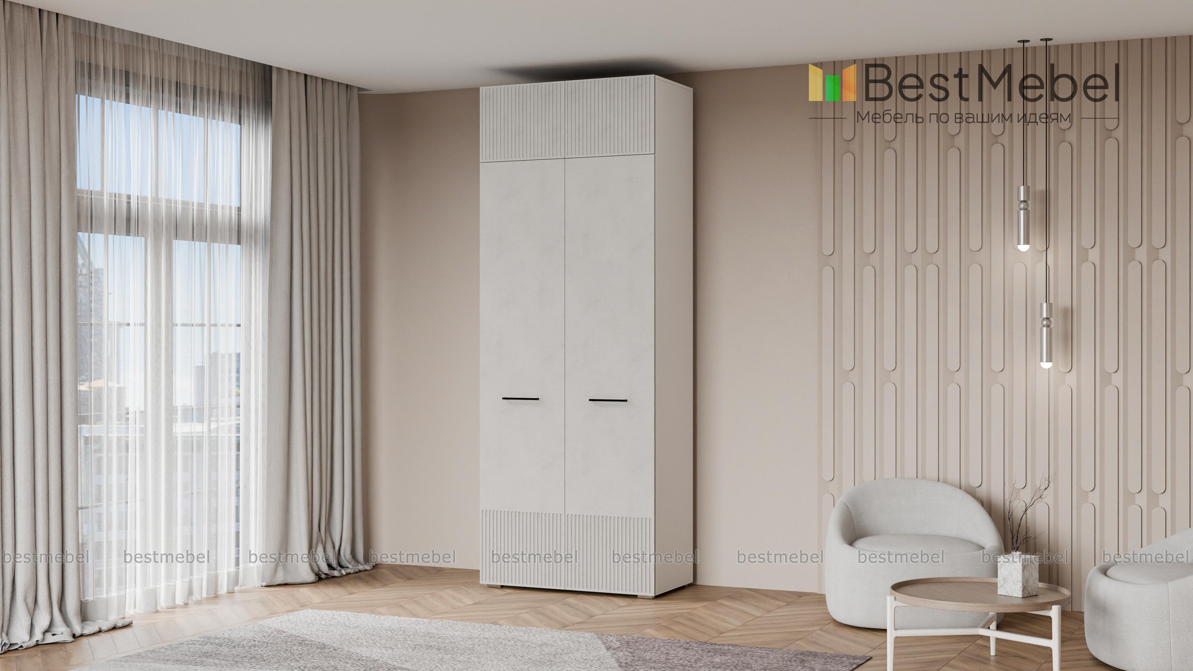 Шкаф распашной Декарт 8 BMS поможет быстро навести порядок в небольшой комнате. Двухдверный гардероб имеет базовое наполнение из штанги и верхней полки, а дополнительное пространство для хранения дает антресоль. Всегда актуально выглядит светлый фасад из МДФ с классической фрезерованной отделкой и контрастными поперечными скобами. Купить шкаф распашной Декарт 8 BMS в нужном размере и цветовой гамме приглашаем недорого на сайт нашего интернет-магазина.
