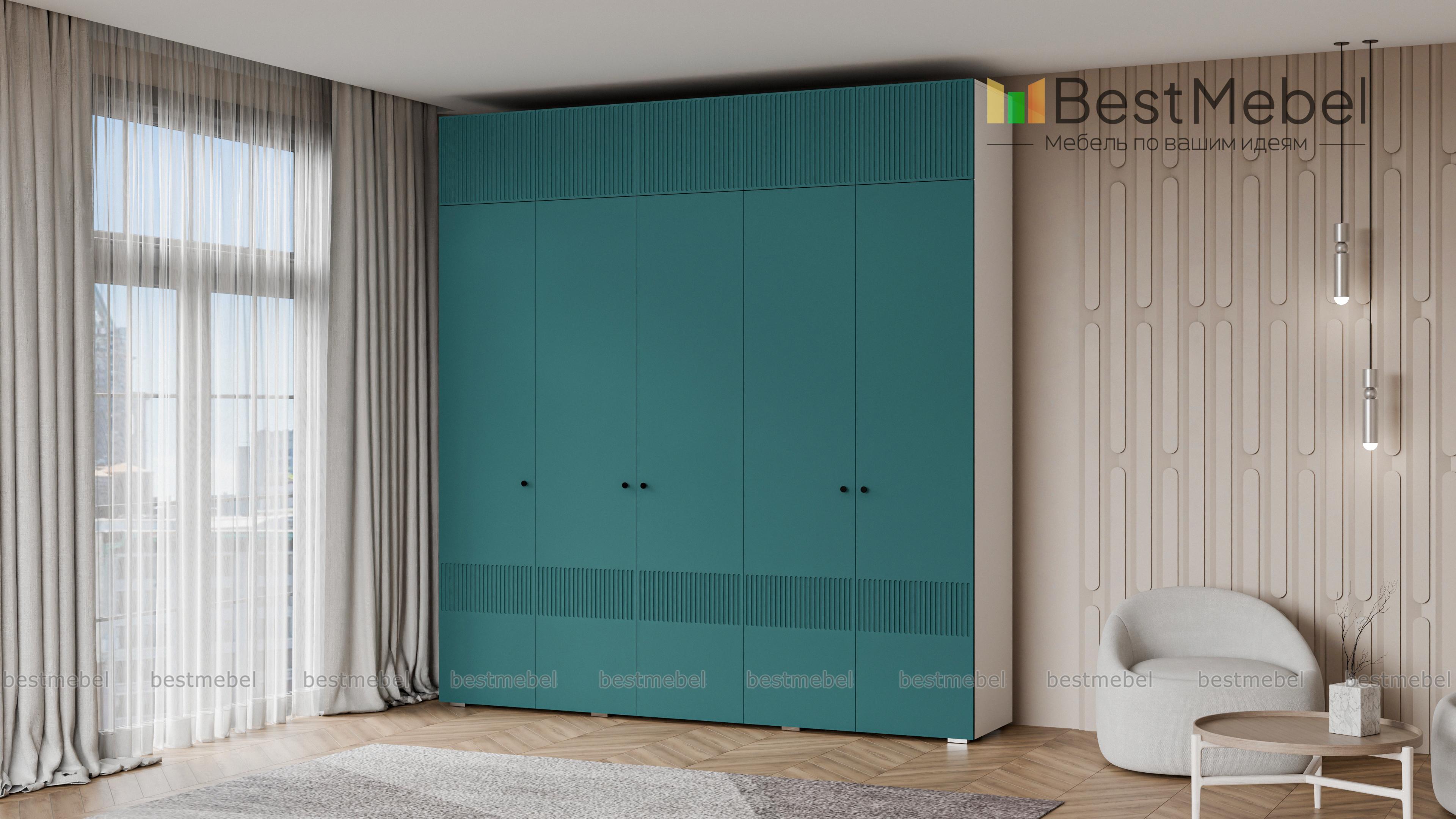 Шкаф распашной Джосс 11 BMS с антресолью — практичное и эстетическое решение для вашего дома. Пространство будет занято до потолка — значит, появится больше места для хранения как повседневного, так и сезонного гардероба. Внутри пятидверного шкафа располагаются две штанги и ряд бельевых полок, а сплошной фасад яркого аквамаринового цвета декорирован стильным рельефом. Купить шкаф распашной Джосс 11 BMS вы сможете на сайте нашего интернет-магазина в необходимом размере и любых оттенках из каталога.