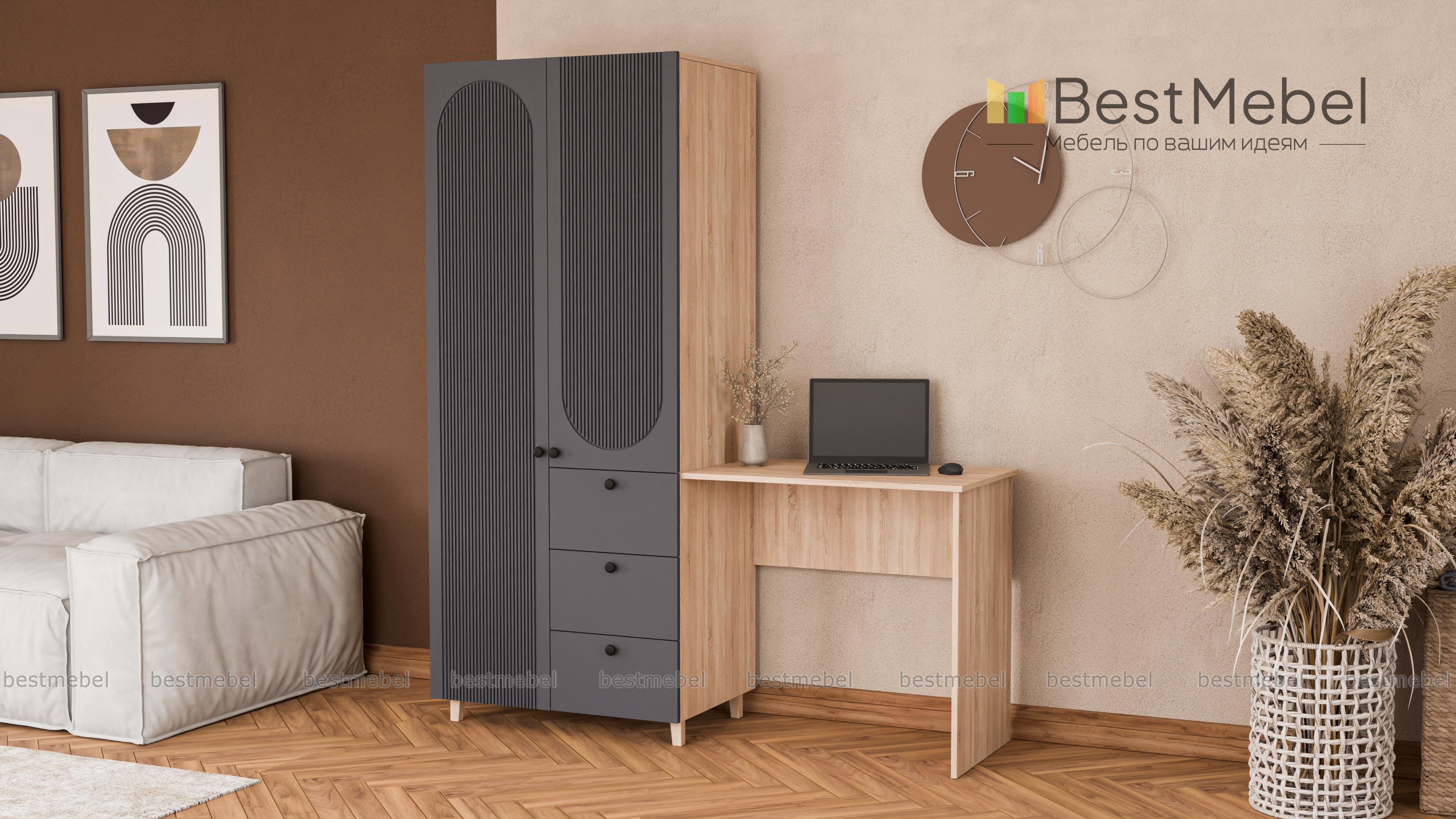 Шкаф со столом Рене 6 BMS объединил рабочую зону и удобную систему хранения. Элегантный гардероб с высокими ножками и фрезеровкой дополнен прямоугольным письменным столом справа. Для хранения вещей предусмотрены распашное отделение и ящики, а размеры столешницы позволяют разместить ноутбук, письменные принадлежности, материалы для творчества. Купить шкаф со столом Рене 6 BMS вы сможете в нашем интернет-магазине, подобрав размеры и наиболее подходящую цветовую гамму.