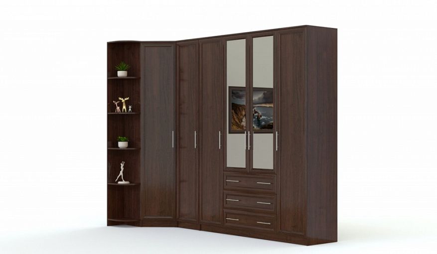 Угловой шкаф Маша 3 BMS имеет практичную Г-образную форму, позволяющую выгодно использовать особенности планировки. Модель классического дизайна с рамочными фасадами выглядит элегантно в темных древесных тонах. Продуманная система хранения включает в себя глухие распашные отделения с полками и штангами, секцию с зеркальным фасадом, три выдвижных ящика для мелочей и торцевой стеллаж с радиусными полками. Купить угловой шкаф Маша 3 BMS для меблировки спален, гостиных или прихожих вы сможете в нашем интернет-магазине.