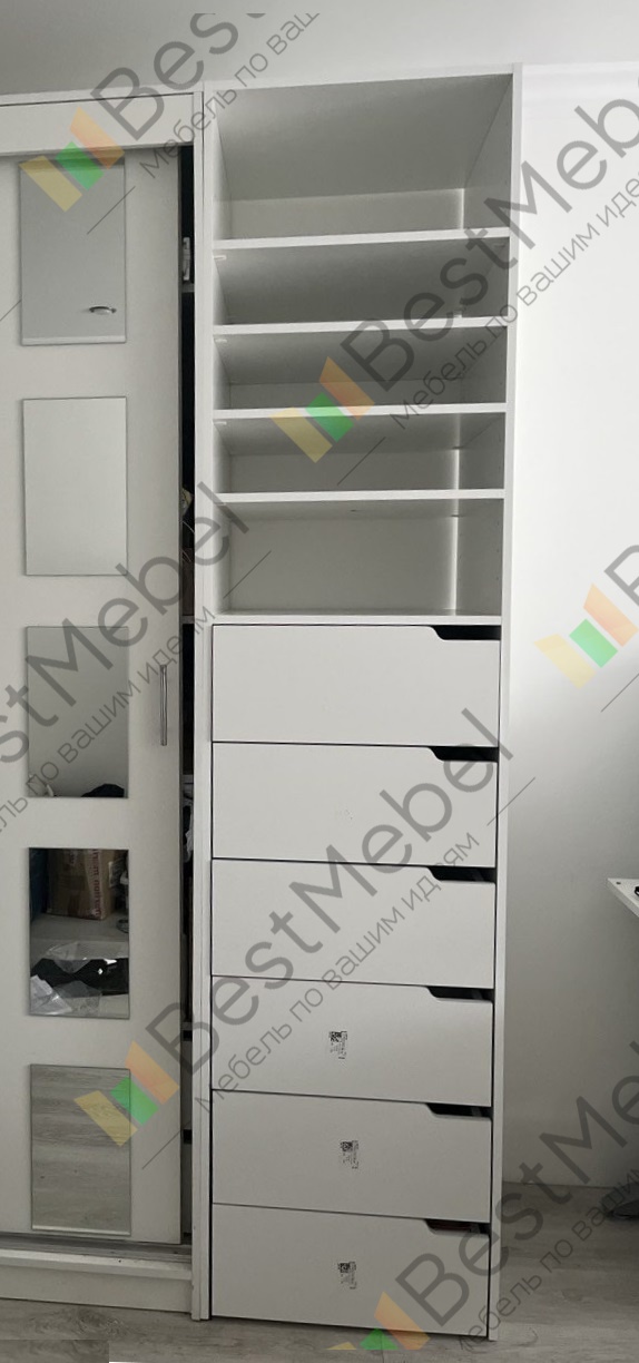 Заказ 00000341133. Люблю эту компанию за то, что все можно добавить и заказать по своим размерам, брала лет 5 назад у них шкафы, отличные, стоят как новенькие. В январе 2025 заказала Стеллаж для одежды Мирта 37 BMS с дополнениями которые мне были нужны, в этот раз как и в прошлый заказала ящики с ДСП дном, они очень хорошо себя показали, прочные удобные, не беспокоюсь, что дно прогнется или тяжелое нельзя класть. У меня кот Мэйн-кун 8 кг. Часто лежит в выдвижном ящике, в котором хранятся его лакомства. По прошлым заказам поняла, что все качественное, не стала заказывать суперпрочную кромку, да и вообще то что мне было моей целью оставила по умолчанию в базовом варианте и всё как в прежние годы великолепно. Привезли и подняли, занесли в квартиру без всяких уговоров, быстро вежливо! Сборщик приехал в удобное для нас время, собрал при нас, быстро и качественно!!!