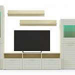 Стенка Тирамису 5 BMS – это модульная композиция для небольшой современной гостиной. В комплект входят широкая низкая тумба с выдвижными ящиками и надстройкой под аппаратуру, два комбинированных с витринами шкафа разной высоты и навесные полки для книг и предметов декора. Корпус светлых древесных тонов дополняют белые фрезерованные фасады, а уютный вид интерьеру придаст встроенная подсветка. Купить стенку Тирамису 5 BMS вы сможете в нашем интернет-магазине по доступной цене.