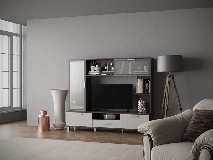 Гостиная Тиса-35 BMS – компактная модель, представляющая собой единую композицию из закрытых отделений и открытых полок с нишей под ТВ в центральной части. Для наиболее удобного размещения техники, предметов декора и мелочей модель оборудована тумбой, вертикальной и горизонтальной витринами. Контрастное цветовое решение не только практично, но и элегантно смотрится в большинстве современных интерьеров. Купить гостиную Тиса-35 BMS недорого вы сможете в нашем интернет-магазине.