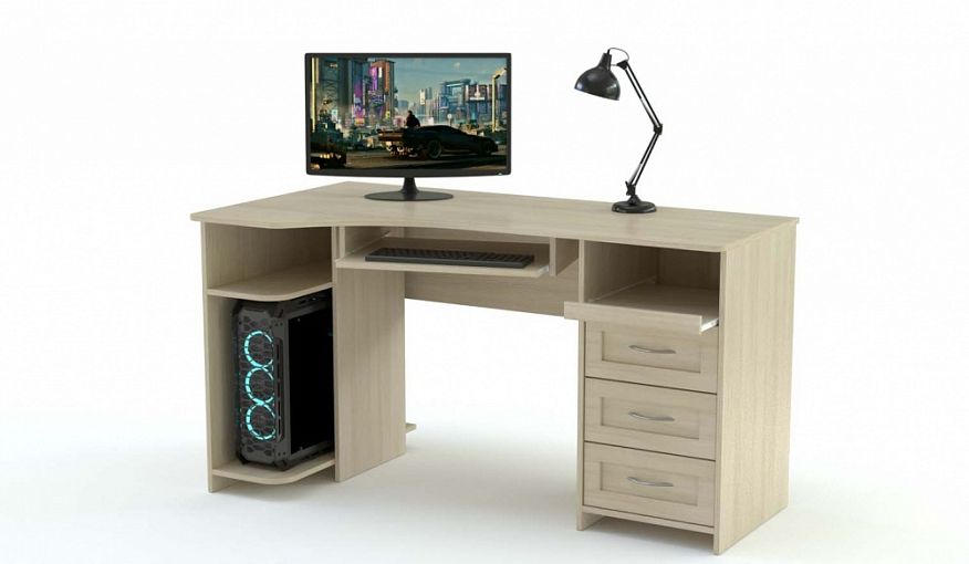 Стол Практик-130 ‒ это отличное решение для оформления полноценной рабочей зоны. Классический дизайн стола прекрасно подойдет к Вашему интерьеру и позволит расположить необходимую Вам компьютерную технику. Специальные полки под системный блок и клавиатуру позволяют Вам не занимать основное рабочее пространство. На просторную столешницу поместится монитор с большой диагональю. Выдвижные ящики в боковой части стола позволяют хранить все необходимые документы. Купить этот стол можно у нас на сайте.