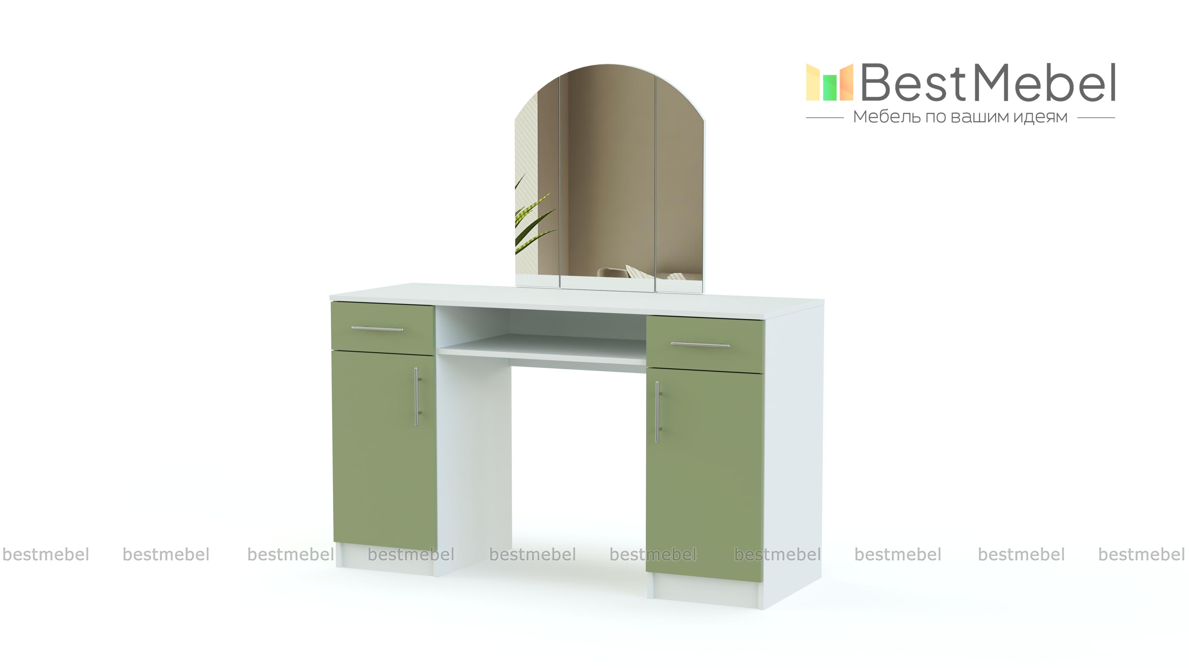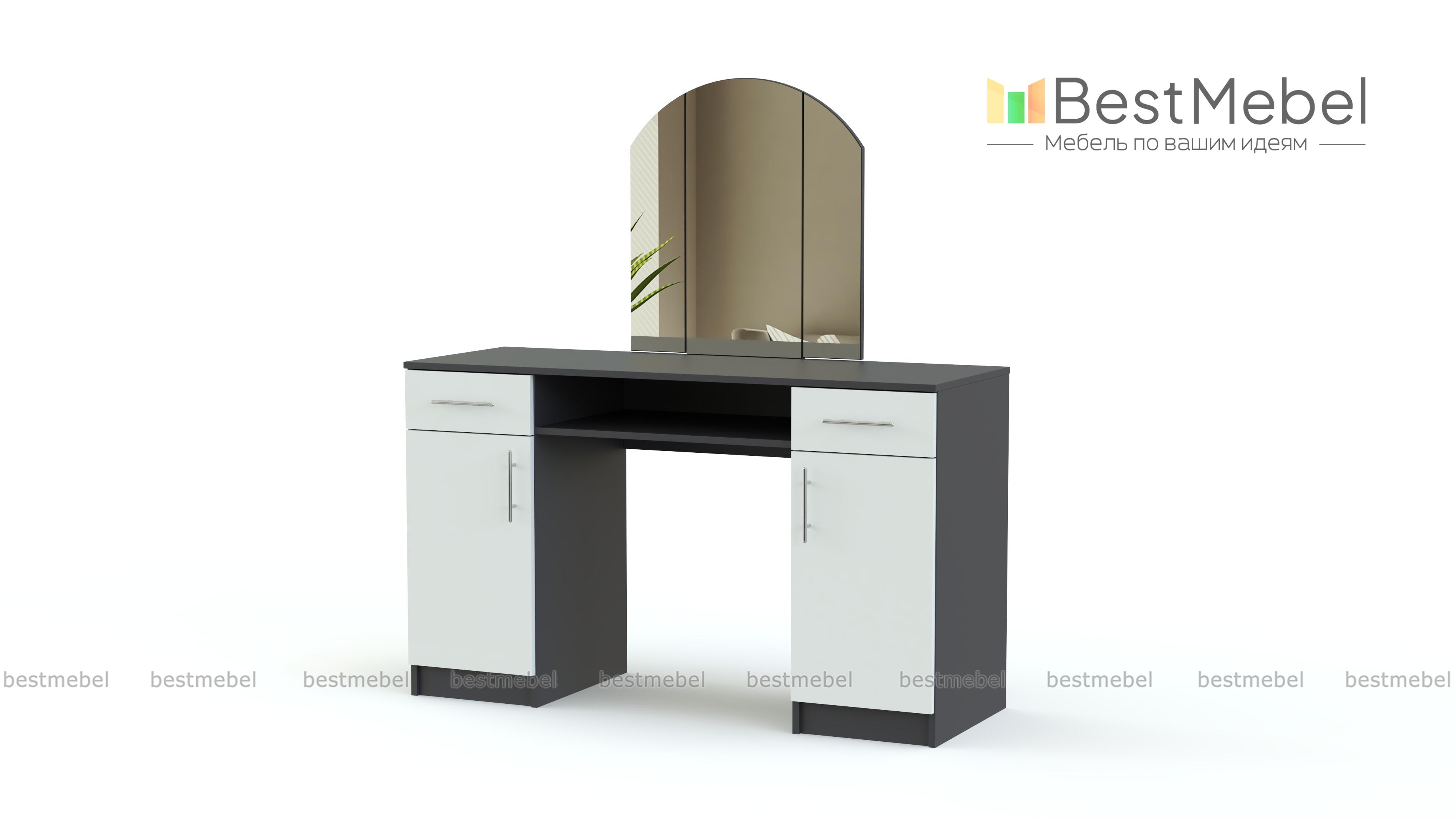 Элегантная яркая модель для современной спальни. В комплект этого функционального столика входят трехстворчатое зеркало, с которым будет удобно делать прически, две боковых тумбы с выдвижными и распашными ящиками и открытая центральная полка. Вместительный туалетный столик Paris BMS разместит все необходимое для макияжа, парфюмерию, аксессуары и множество нужных мелочей. Выполнен трельяж в белом корпусе, фасады тумб – контрастный матовый в нескольких вариантах на выбор.